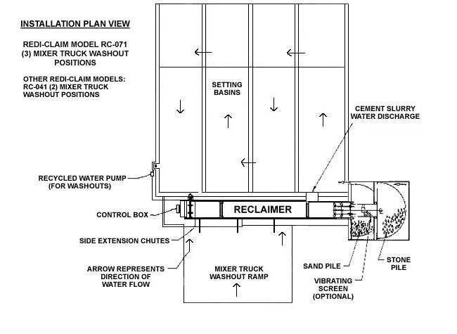 A washout system operates without settling pits and provides recycled water from the machine for washouts. That's the JADAIR Redi-Wash Washout System (click here for more info), which fits the needs of the majority of producers. It includes both a reclaimer stage like the JADAIRTM Redi-ClaimTM unit plus a water clarifier. Washout water never gets on the ground with a washout system from JADAIRTM .